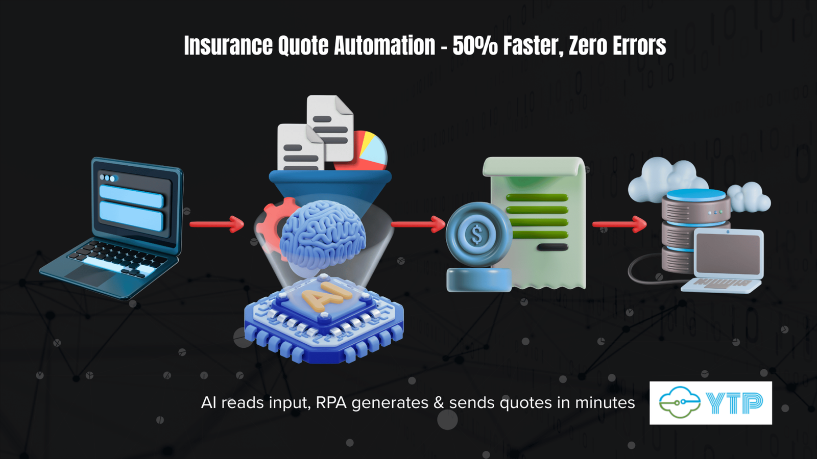 We introduced a fully automated AI + RPA solution that reads customer inputs, determines eligibility and pricing, and generates quotes. The system integrates tightly with Salesforce, their policy admin system, custom quoting engines, and email workflows.